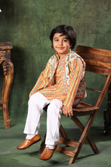 Geometric Print Gota Embellished Jacket paired with Linear print  kurta  and pyjama